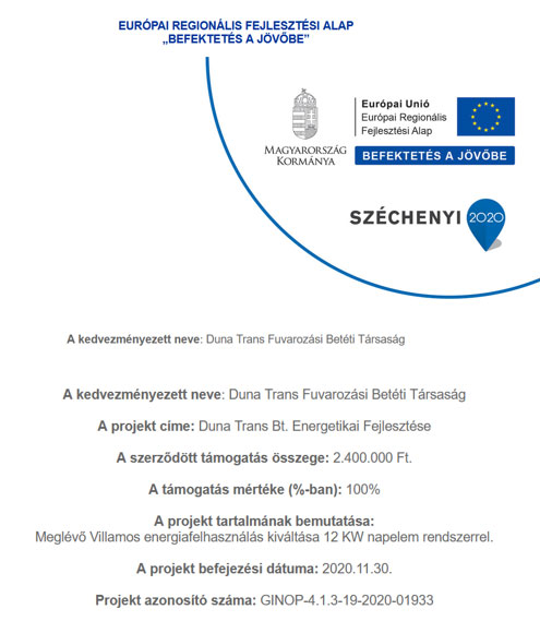 A projekt címe: Duna Trans Bt. Energetikai Fejlesztése